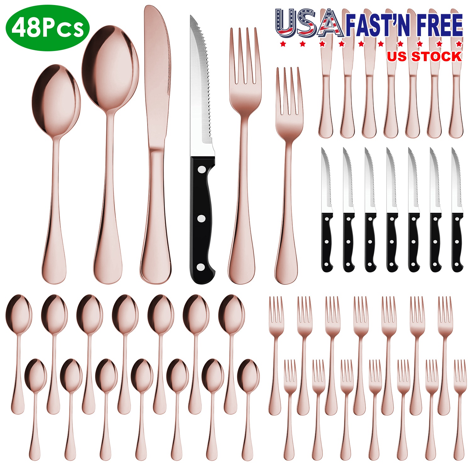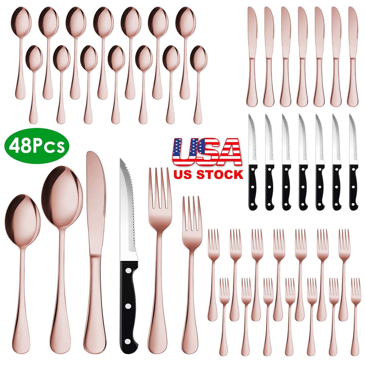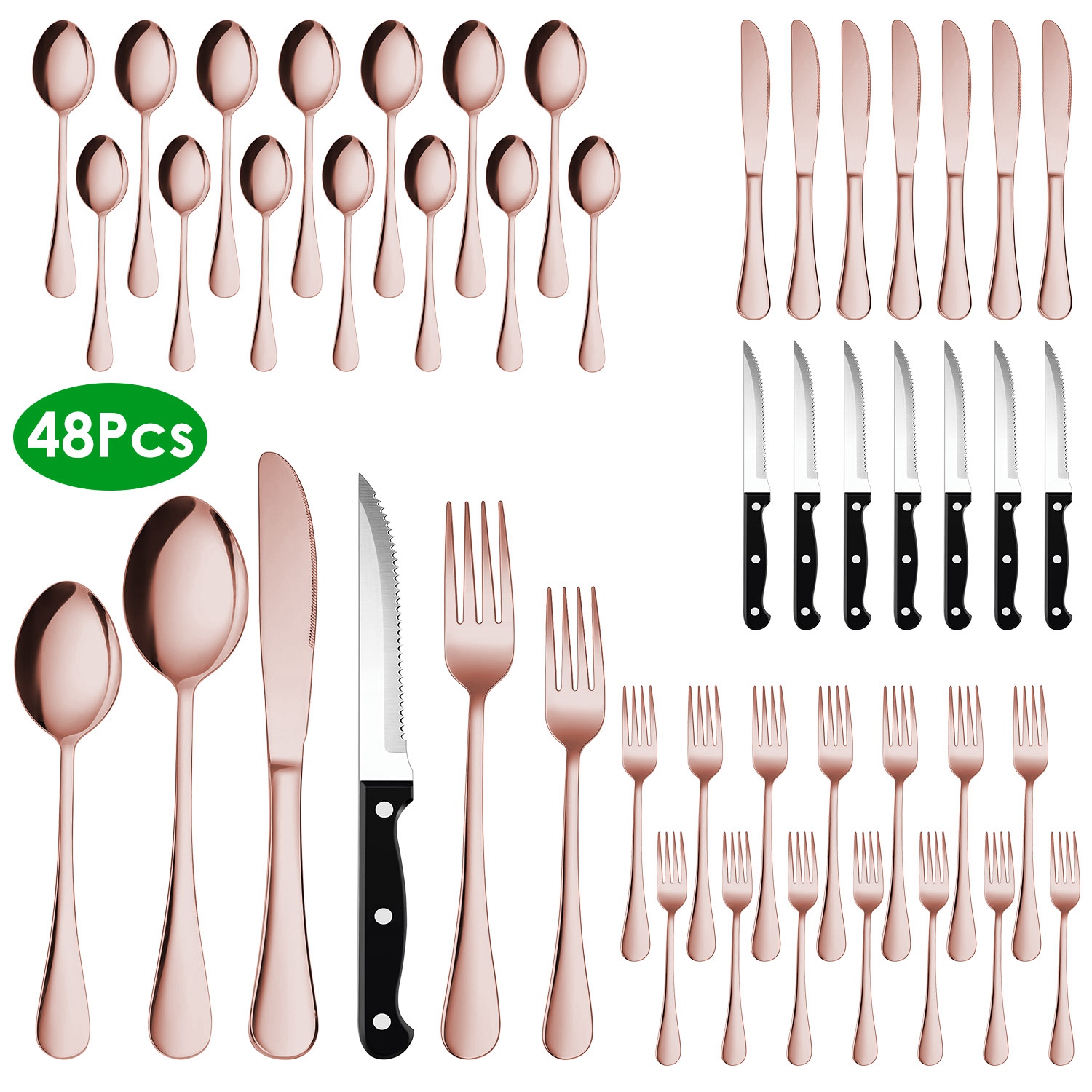 Our 48Pcs Silverware Set including 8 dinner forks, 8 salad forks, 8 dinner knives, 8 steak knives, 8 dinner spoons and 8 tea spoons, able to serve for 8 people, is great for family daily use, entertaining guest, wedding or other occasions. Made of 410 stainless steel and processed with vacuum electroplate technology, it's smell-free, rust-resistant, sturdy, not able to bend, and with smooth edge which makes you use it without worry. It's dishwasher safe, and easy to clean. Rose gold/ silver/ black colors are optional, perfect gift for your friends, newlyweds or new homeowners in Thanksgiving Day, Wedding, Party and events.