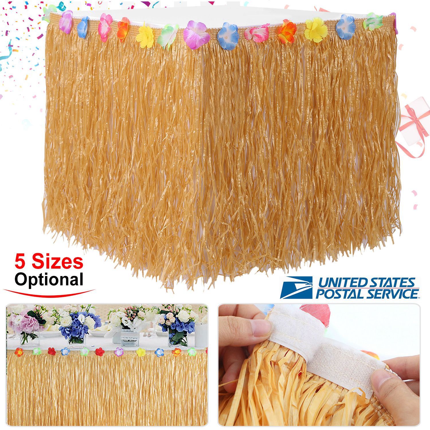 Grass Table Skirt Hawaiian Luau Party Decorations Supplies w/Hibiscus for Buffet BBQ Tiki Bar Beach Birthday Party Use
