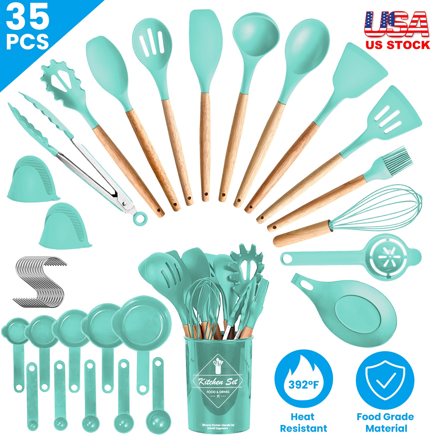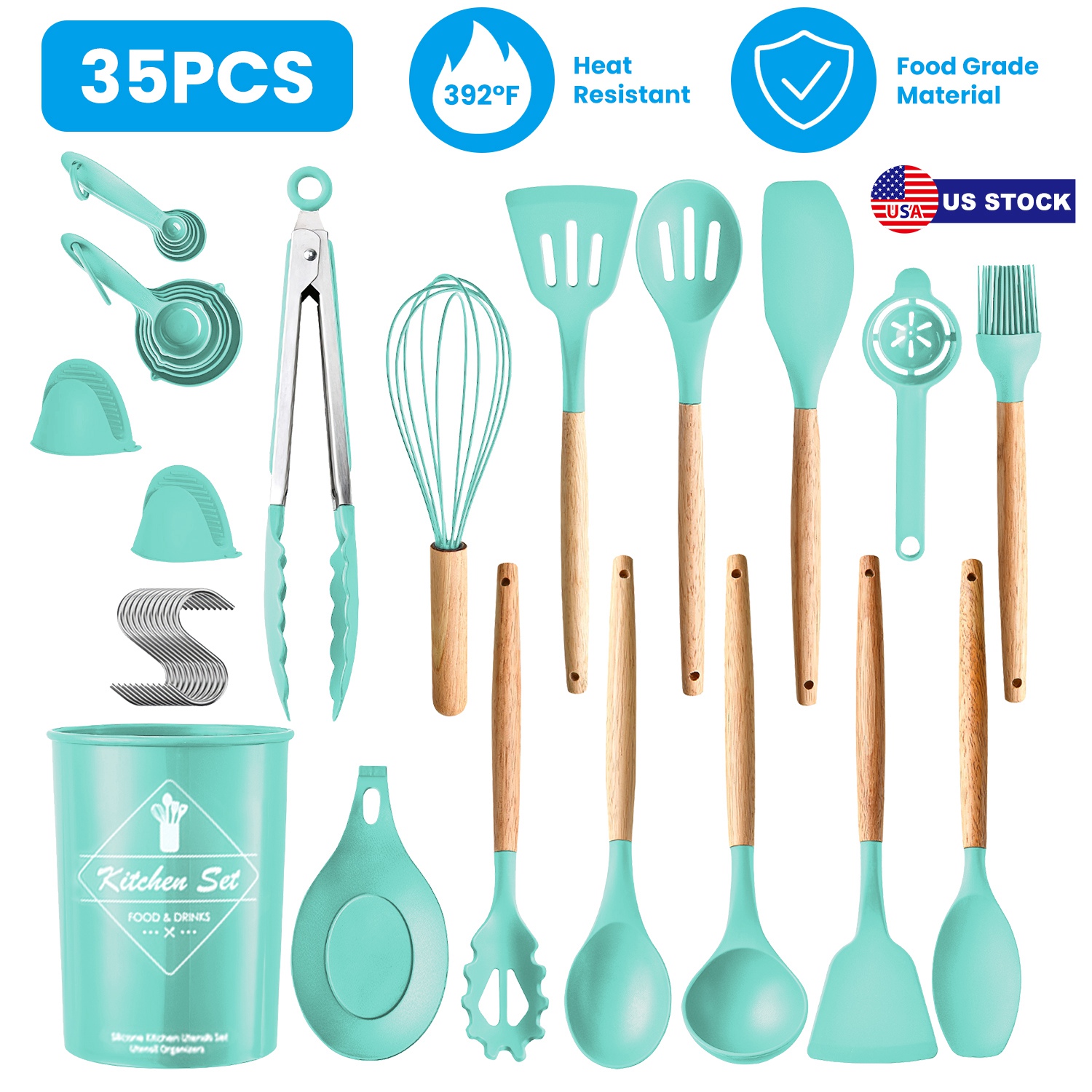 Looking for kitchen essentials for home? Our 35Pcs kitchen utensils set can streamline your culinary tasks, simplifying the preparation of fish, fruits, vegetables, eggs and so on. Made of BPA-free silicone and stainless steel, our utensils are durable and safe to use. Heat resistant up to 392℉ and ideal for use when cooking or baking, without warping, bending or flaking. Protect your non-stick cookware from scratching. Each piece is easy to clean by hand. Come with 10 hooks for easy hanging and 1 utensil holder to keep these aesthetic kitchen essentials well organized. Take this kitchen tool set and cook with a good mood!