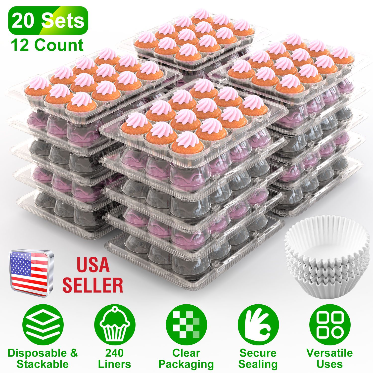 Home > 12 Count 20 Sets Clear Cupcake Boxes Disposable Cupcake Containers Stackable Cupcake Carrier Holders with 240 Liners High Dome Lid