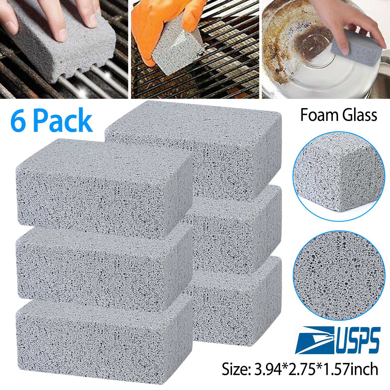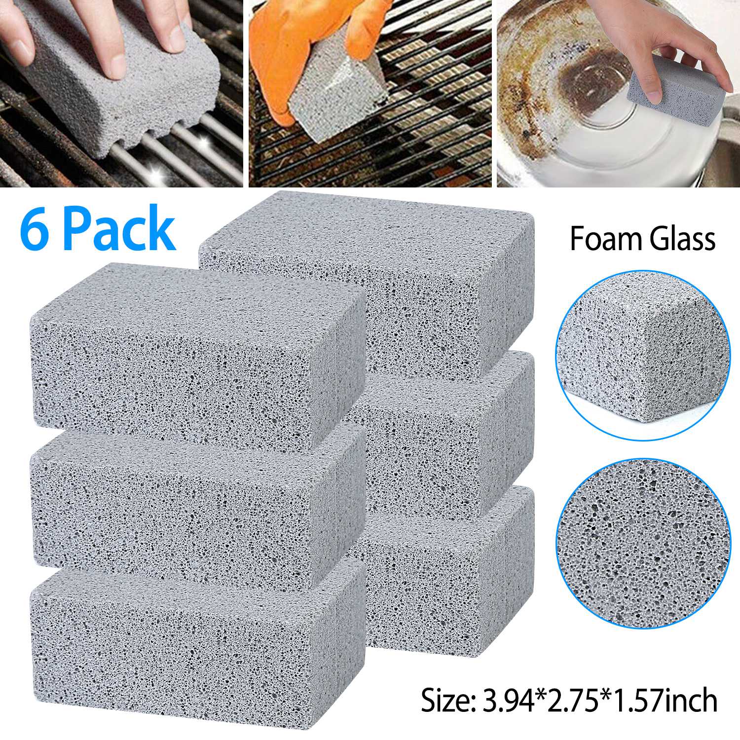 Are you tired of your grill brush breaking off, getting into the food? STOP! Here come this iMounTEK 6Pcs Grill Cleaning Blocks. Made of non-porous abrasive foam glass and is about 3.9 x 1.57 x 2.75 inches, it is perfect for your palm and can help you grease, stains, residues and dirt without scratching surfaces. Typically one grill cleaning block lasts about 4-5 cleanings. No more worry about ingesting broken-off brush bristles.