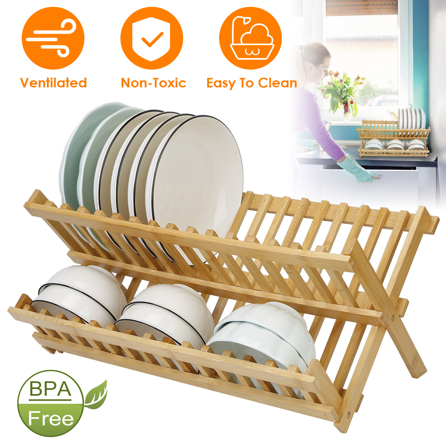 Bamboo Dish Drying Rack 2-Tier Foldable Dish Drainer Kitchen Plate Utensil Rack Holder Dish Tableware Drainer