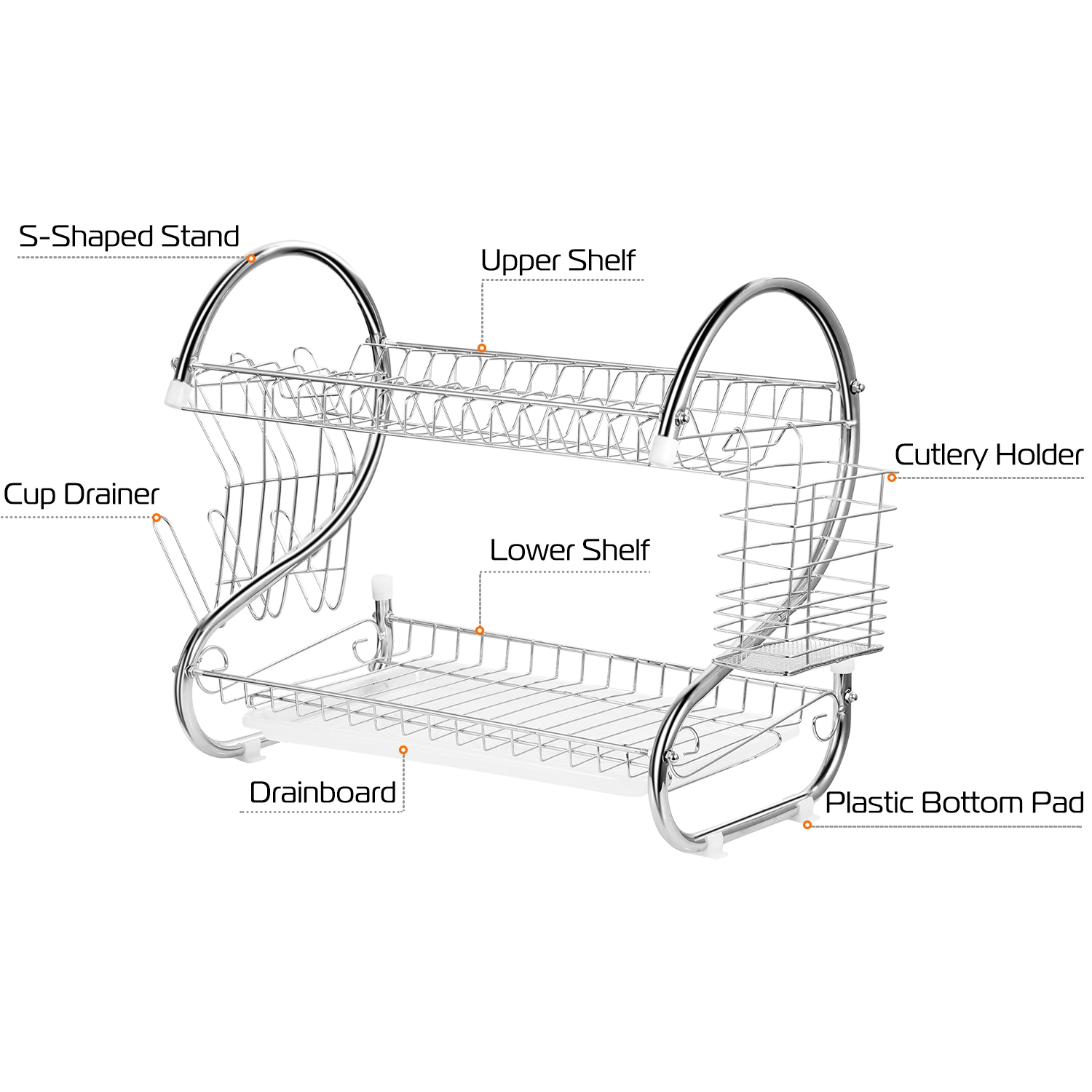 2-Tier Dish Rack Chrome-plated Steel Kitchen Drying Rack w/ Cup Drainer Cutlery Holder Removable Plastic Drainboard