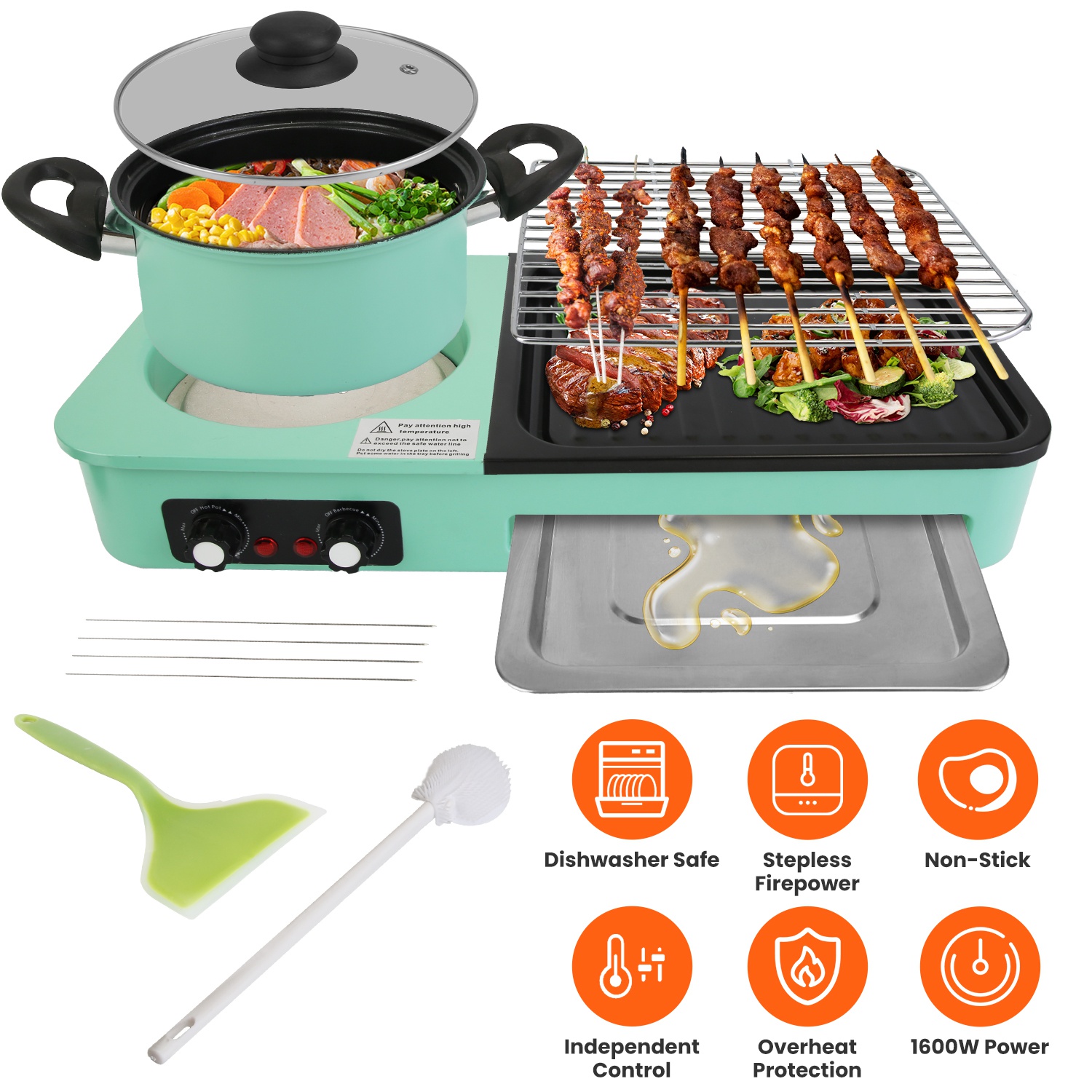 Featuring powerful 1600W heating tubes, our electric grill with hot pot ensures fast, even, and safe heating for perfectly cooked dishes every time. With separate control knobs for the hot pot and grill pan, adjusting temperatures is effortless, providing precise cooking control for your meals. Cleaning up is a breeze thanks to the innovative detachable design of the hot pot and grill pan, allowing for easy separation from the electric body and dishwasher-safe cleaning. Perfect for gatherings of 3-5 people, our electric hot pot with grill is the ideal solution for enjoying a hot pot feast, grilled delicacies, and fried favorites all at once.