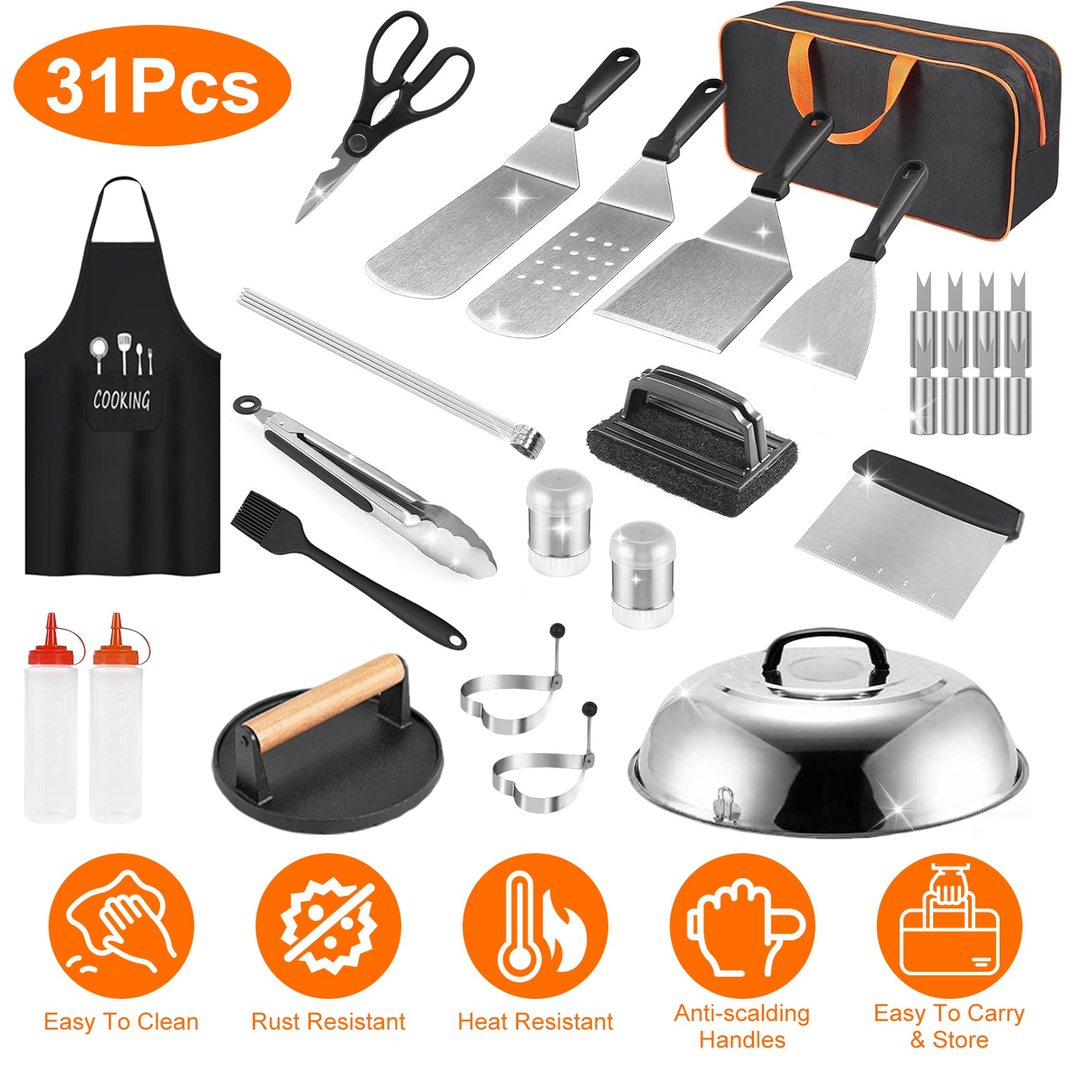 This 31Pcs griddle accessories kit includes everything you need for your griddle cooking, an perfect gift for anyone who loves to cook, whether they are a professional griller or a weekend BBQ enthusiast. Ideal for birthdays, housewarmings, or special occasions, this set adds both function and fun to the kitchen or grill. The handles are anti-scalding. Constructed with food-safe and sturdy materials, easy to clean. Include a large storage bag to keep everything neatly organized and easily accessible, whether you're storing your accessories at home or taking them on the go.