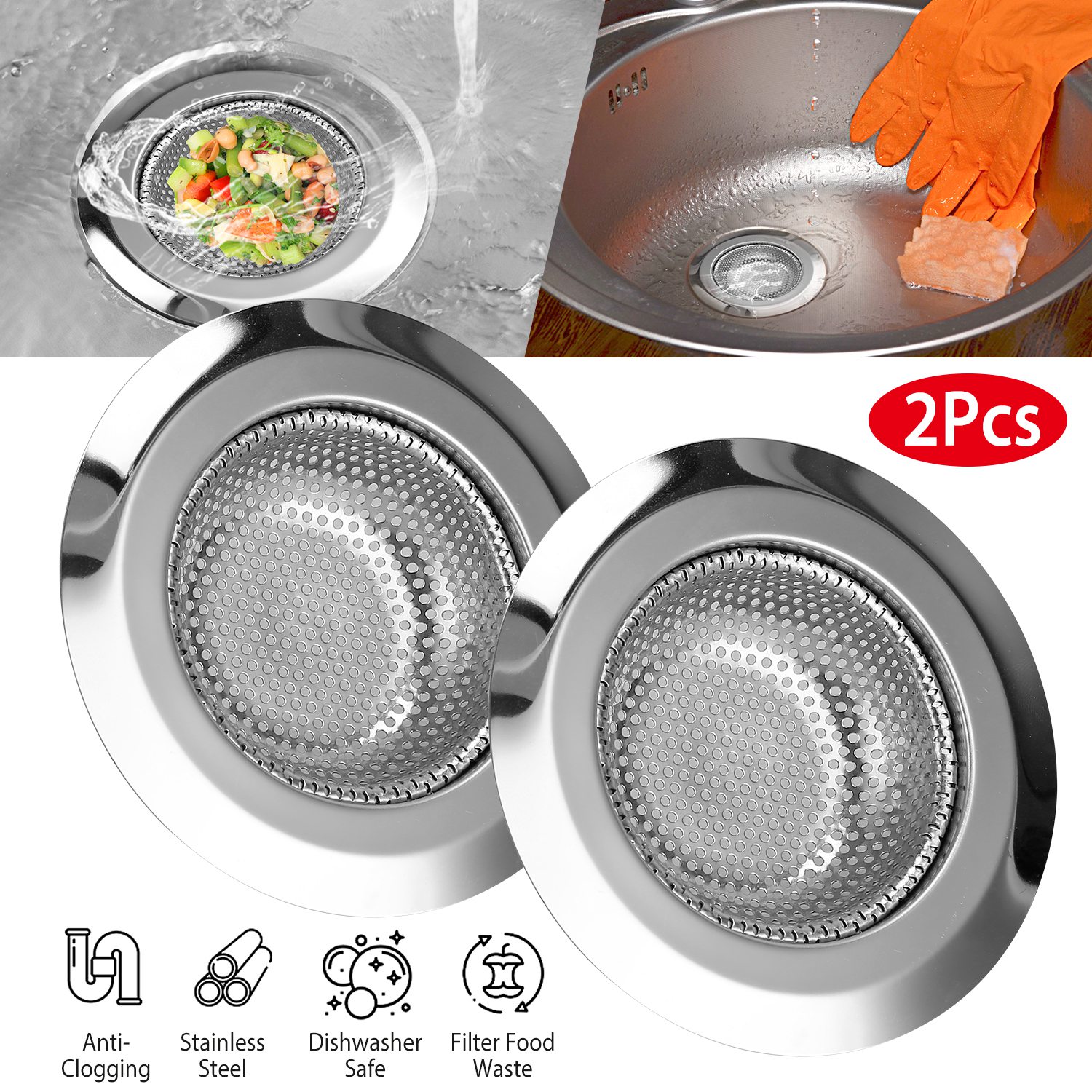 2Pcs Stainless steel strainers are suited for long-lasting protection against plumb clogging and save much time on dish washing. 2mm/0.07in Diameter perforation holes let liquid flow seamlessly into the drain while it blocks food particles. 0.74in Flat rim rests over sink's drain. Quickly wash with warm soapy water to keep the mirror finish shine impeccable over time. Dishwasher safe and they are suitable for 2.96in-3.93in drain strainer outlet. Please measure before purchasing.