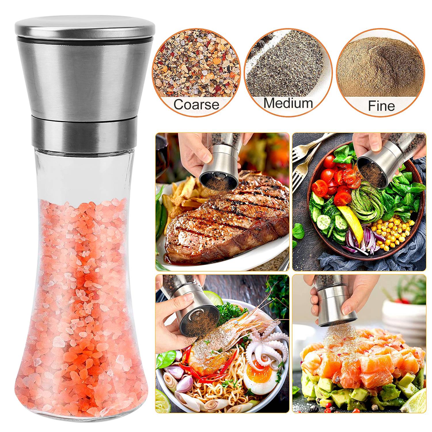 Home > Stainless Steel Salt Pepper Grinder Tall Glass Sea Salt & Pepper Mill Shaker w/ Adjustable Coarseness